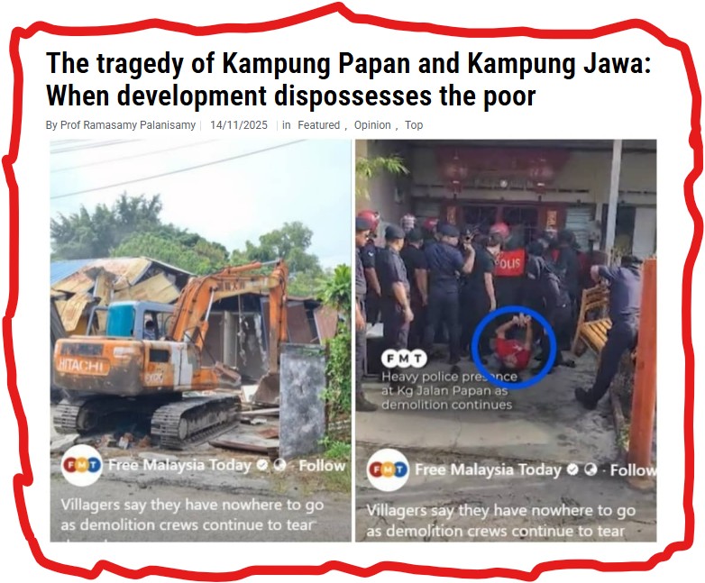 Recently, homes in Kampung Papan, Pandamaran, Klang were demolished despite the opposition and appeals to the Menteri Besar of the state.