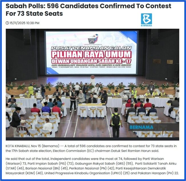 All in all, Perikatan Nasional (PN) will contest 42 of the 73 seats in the state polls which attracted a record-breaking 596 candidates, a 33.3% jump from 447 candidates in the previous 2020 election, according to the Election Commission (EC).