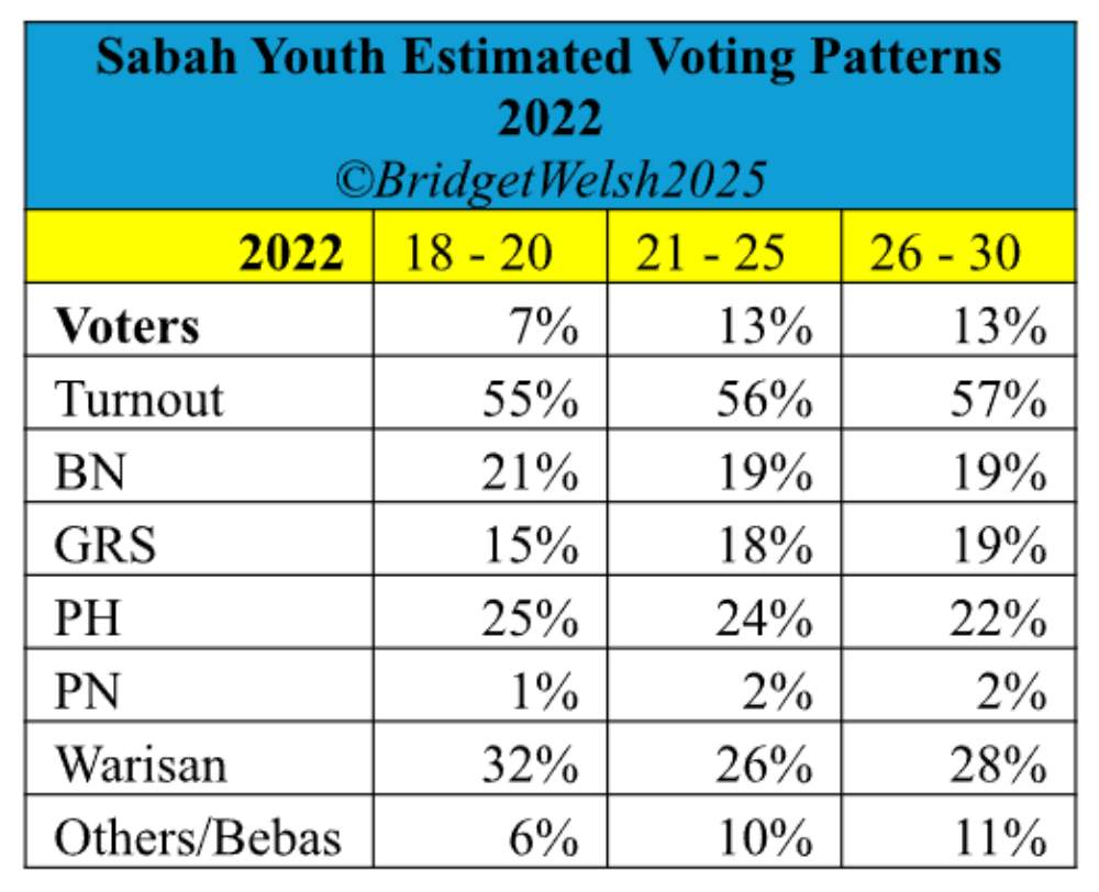 Sabah youth in 2022 were largely split among Warisan, Pakatan Harapan and BN, followed by Gabungan Rakyat Sabah (GRS). Perikatan Nasional won minimally in Sabah, as independent candidates did better.