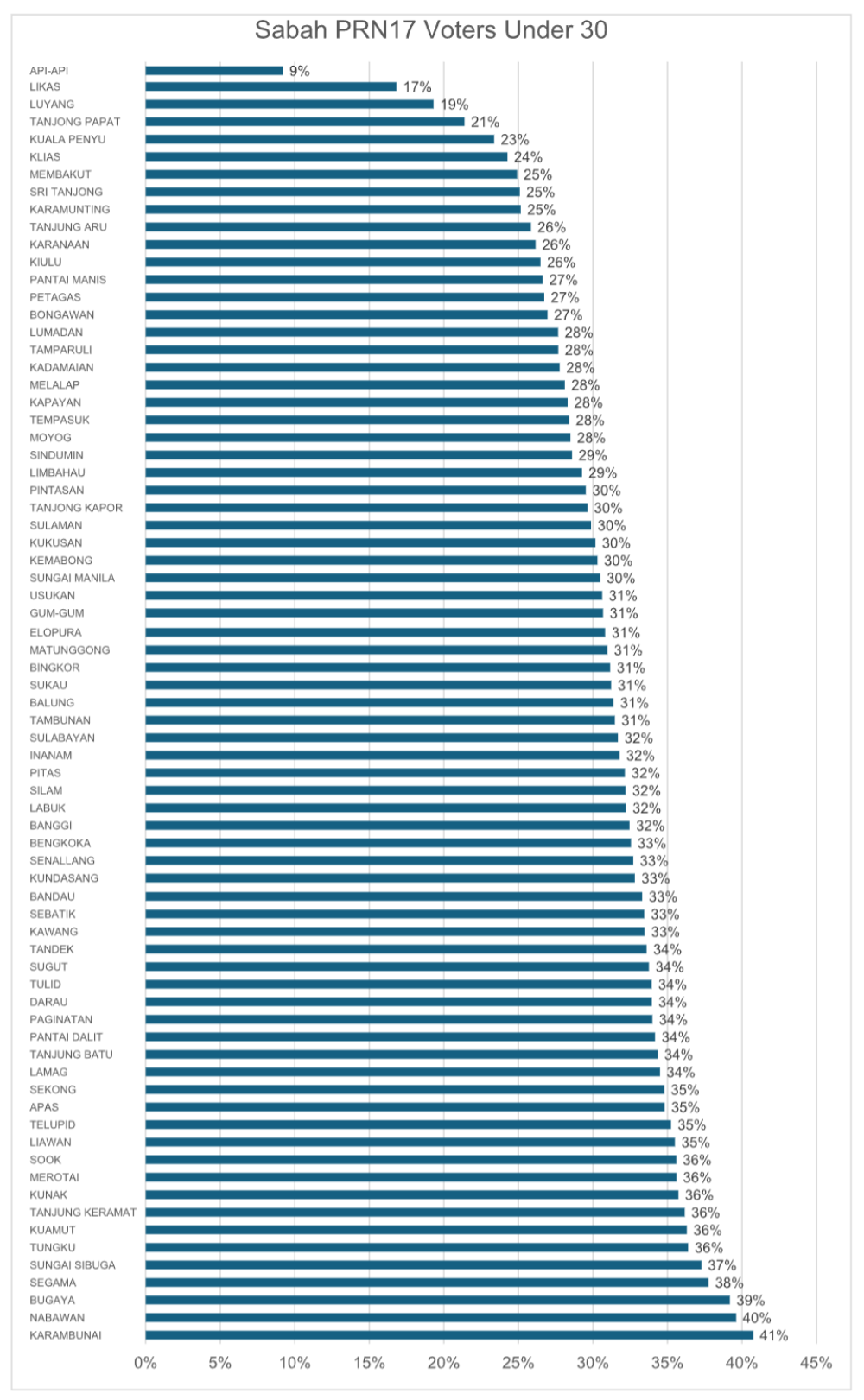 Youth are decisive in all 73 seats, with the exception of Api Api in the heart of Kota Kinabalu, where they only comprise nine percent of the voters.