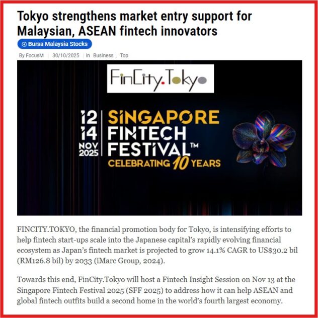 As it is, FinCity.Tokyo works with the Japanese government and the Tokyo Metropolitan government as well as over 50 industry associations, major financial institutions, global investors and service providers to raise Tokyo’s profile as a global financial hub with focus on building a world-leading ecosystem for asset management and fintech. – Focus Malaysia