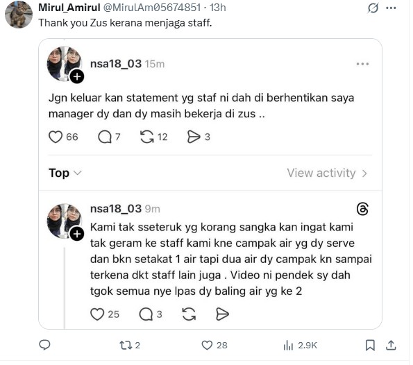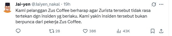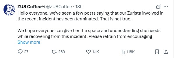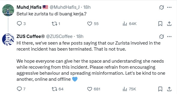 In a tri-lingual statement (English, Bahasa Malaysia and Mandarin), ZUS Coffee was at pains to stress that the employee in question had NOT been terminated. The poor lass was even given the time and space to recuperate from this traumatic incident.
