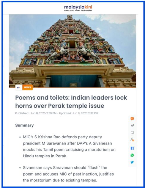 Sungkai MP Sivanesan who once proudly advised the Perak Menteri Besar Datuk Seri Saarani Mohamad to reject MIC appointments now struggles to explain why temple land issues in Perak remain unresolved under his watch.