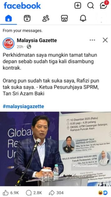 In his address at the MACC–UiTM Inspira 2025: Hari Integriti & Kepimpinan programme at UiTM Puncak Alam yesterday (Dec 11), Azam who is also an adjunct professor at Universiti Teknologi MARA (UiTM) admitted that his contract extension has drawn criticism from some quarters.