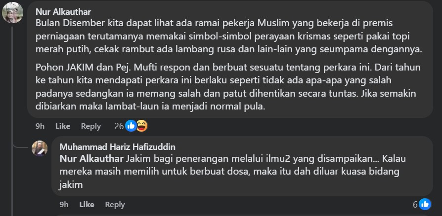 That aside, one commenter voiced concern over Muslim staff at business premises donning Christmas symbols in the likes of the red-and-white Santa cap and reindeer antlers every December.
