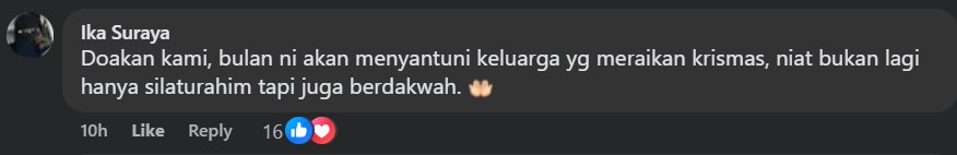 One commenter asked for prayers given her family wishes “to engage with other family members who’re celebrating Christmas with the intention of not only fostering family bond but also to dakwah (to spread a good word on Islam). 🤲🏻”.