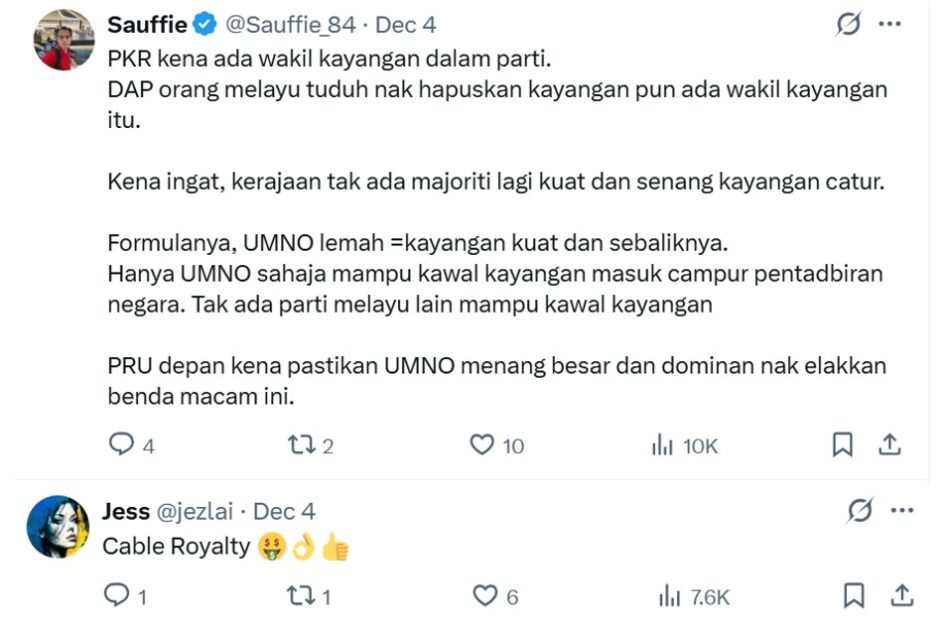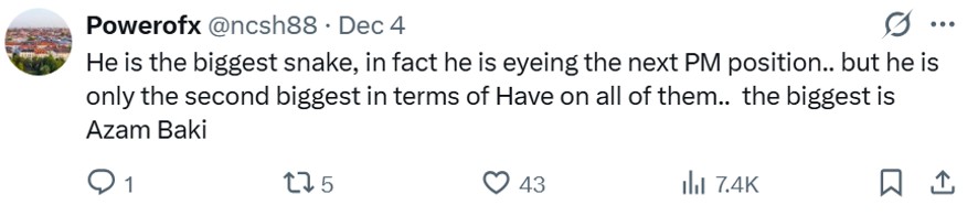 Making the very loaded (but vague) claim is UK-based journalist Rahmah Ghazali (@rahmahghazali) when declaring on X that the “strongest cable in the history of cables (in the context of Malaysian politics) belonged to Tengku Zafrul (Tengku Datuk Seri Zafrul Abdul Aziz)”.