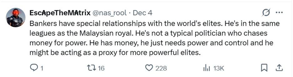 It was also insinuated that the banker-turned politician was a proxy for royalty. One commenter surmised that PKR needed such connection within its ranks to reach out to royal institutions.