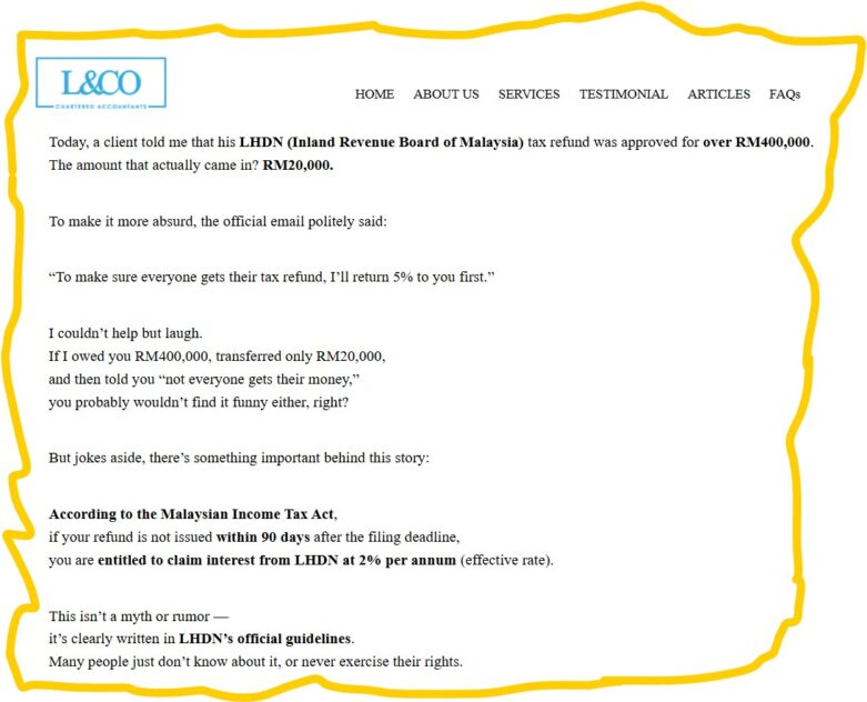 But joke aside, the licensed independent auditor and tax consultant reminded business owners in such situation that under the Malaysian Income Tax Act 1967, they are entitled to claim interest from LHDN at 2% per annum if their refund is not issued within 90 days after the filing deadline.