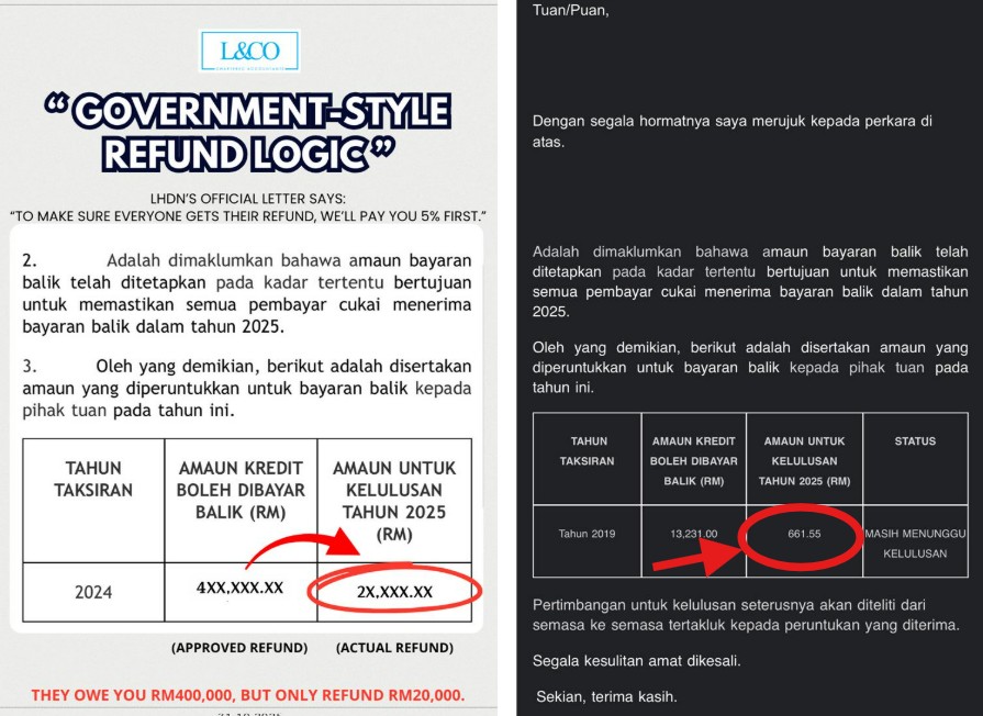 This follows a revelation by chartered accountants L & Co’s co-founder and principle partner Liew Chang Chee that a client has recertify shared with him that although a tax refund of over RM400,000 has been approved by the Inland Revenue Board (LHDN), only RM20,00 or 5% will be disbursed this year (2025).