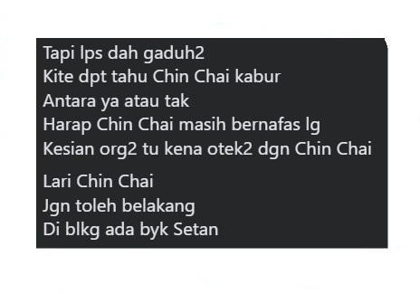 Carrying a message of hope, the ballad hoped that Chin Chai was still breathing – and if so – urged the canine to run and never to look back because there were plenty of devils chasing it down.