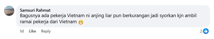 Another dark-hearted commenter sarcastically opined that it was great that the government was allowing more foreign workers from Vietnam to work here. He insinuated that their diet helps keep stray dog population at bay.