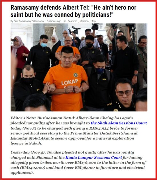 Bingo. Like what ex-DAP stalwart Prof Ramasamy Palanisamy aptly put it, “Tei is no hero or saint as he was the principal person who gave bribes in the mining scandal” but the fact remains that “he was conned by the politicians” – both from the Gabungan Rakyat Sabah (GRS) coalition and even Shamsul himself.