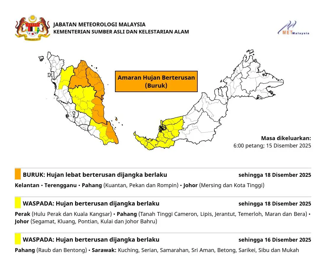 PETALING JAYA: The Malaysian Meteorological Department (MetMalaysia) has issued a continuous rain warning over several states, effective until Thursday (Dec 18).