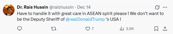 Even pro-Madani think tank EMIR Research founder Datuk Wira Dr Rais Hussin Mohamed Ariff cautioned that the matter “has to be handled with great care in ASEAN spirit” for Malaysia cannot afford to be seen as “the Deputy Sheriff of @realDonaldTrump’s USA!”
