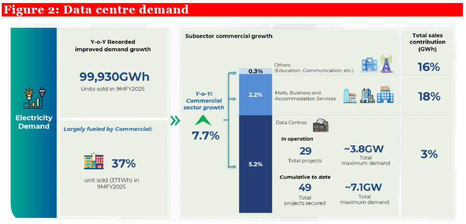 Data centre demand is scaling rapidly, emerging as a key structural driver of electricity growth, with TNB securing 49 projects totalling 7.1GW and actual load ramping up to 850MW by October 2025.