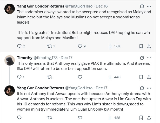 “With most DAP’s leaders demoted (ie Penang DAP chairman Steven Sim Chee Keong takes over the ‘rather Malay-centric’ Entrepreneur Development and Cooperatives portfolio) and given not important portfolios, Anwar is planning for DAP’s exit from Madani,” observed Yang Gor Condor Returns (@YangGorHero).