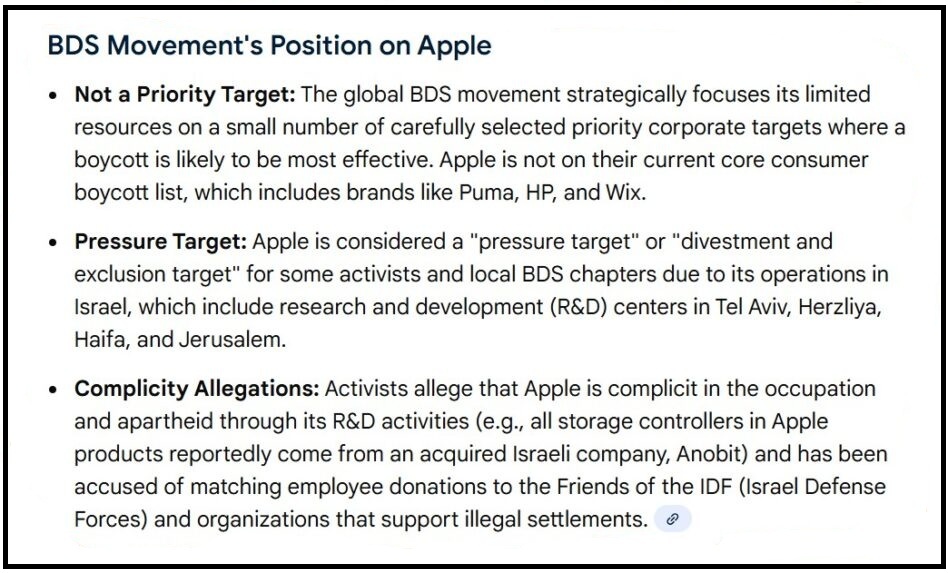 It has since come to pass that despite their very vocal condemnation to Israeli occupation of the West Bank, their opposition does not extend to boycotting Apple products.