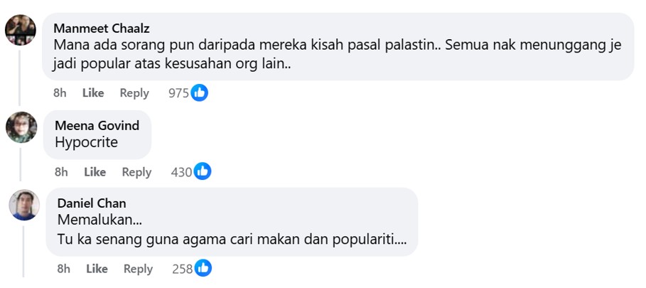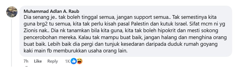 One commenter contended that it was commendable that this Terengganu-born lass has tried to raise awareness of the Palestinian conflict which is far preferable to “sitting at home shaking legs while bad-mouthing others’ efforts on Facebook.”