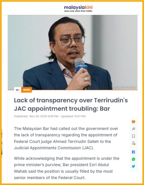The latest move that has further tarnished the incumbent government’s claim of transparency and sense of fair-play is the appointment of Federal judge Tan Sri Ahmad Terrirudin Mohd Salleh to the Judicial Appointments Committee (JAC) for a period of two years effective Nov 15 this year to Nov 14, 2027 as gazetted by the government.