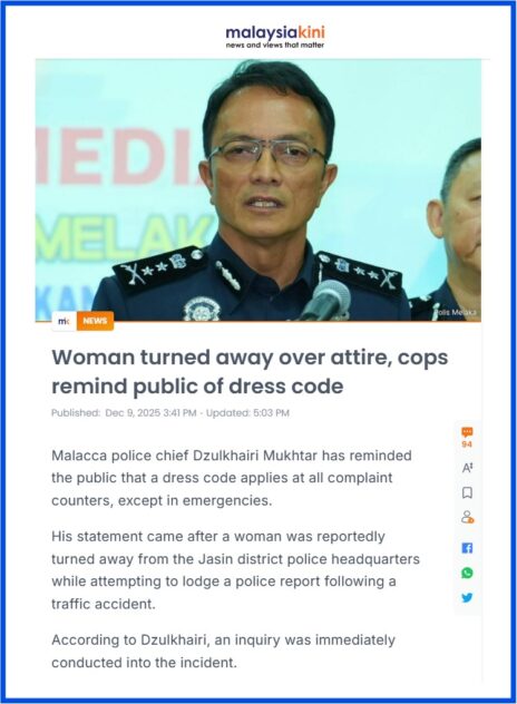 The chain of events was defended by Melaka police chief Datuk Dzulkhairi Mukhtar who reminded the public that a dress code applies at all complaint counters except in emergencies.