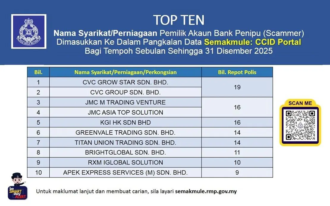 The public are also urged to verify the names of suspicious companies and the number of bank accounts with the CCID SemakMule database, and if a warning is shown, that means that the company or bank account is linked to fraudulent activities. - Bernama