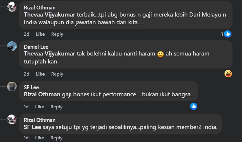 However, such joy was temporarily short-lived when one Malay parent – while praising such development – lamented that “their (Chinese employees) salaries and bonuses will still exceed that of Malays and Indians even though their ranks are lower”.