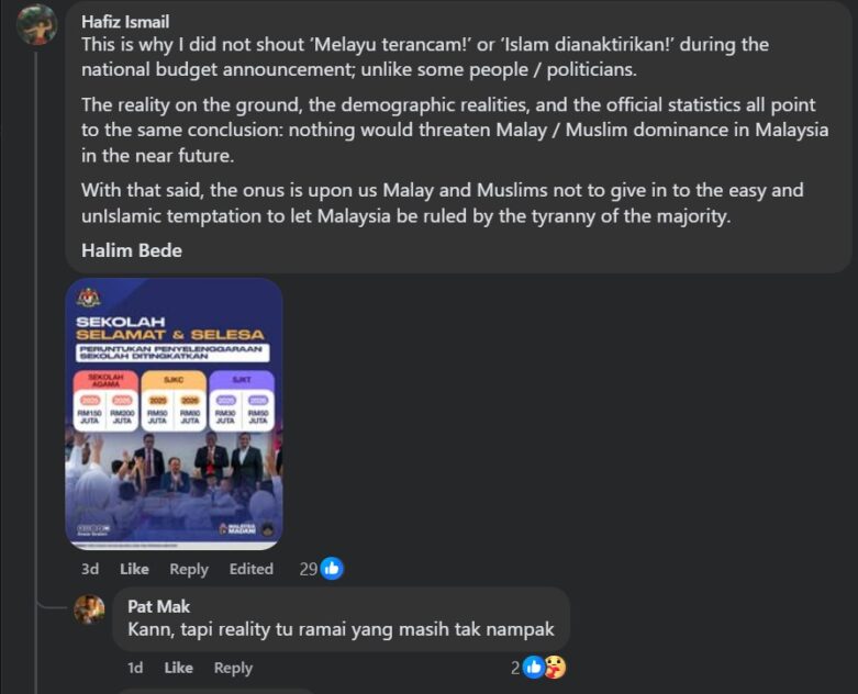 “This is why I didn’t shout ‘Melayu terancam! (Malays are threatened!)’ or ‘Islam dianaktirikan! (Islam is undermined)’ during the national budget announcement unlike some people/politicians,” he shared.