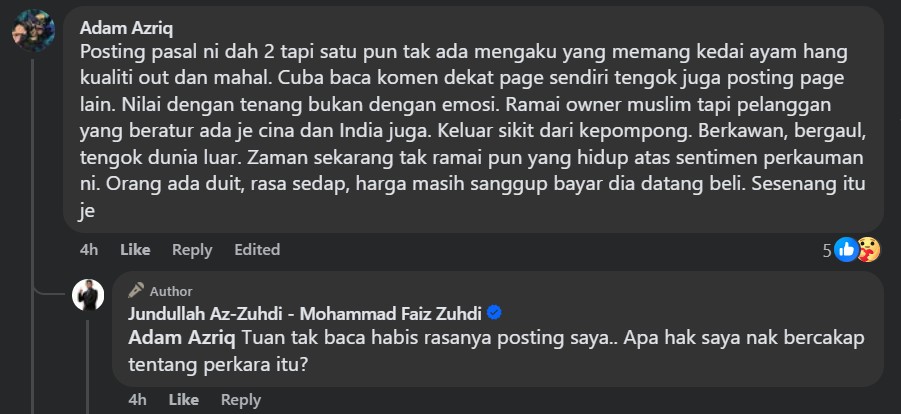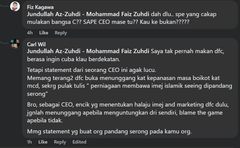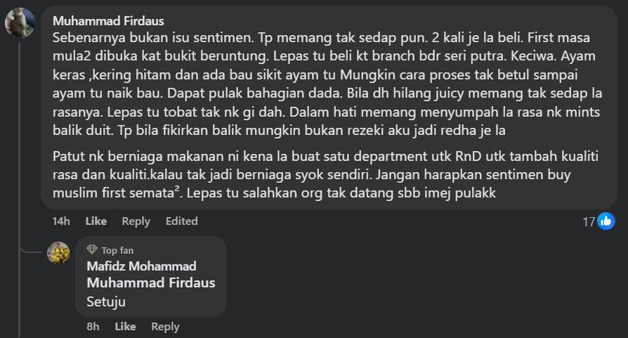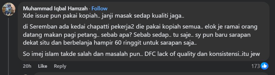 This is when one commenter enlightened him that “customers have no issue with his wearing the kopiah so long as his food quality is tip-top”. Pointing to DFC lacking quality and consistency, he added: