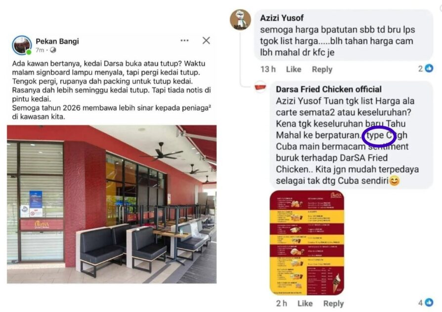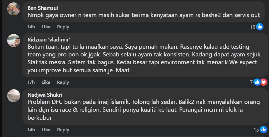 The bottom-line as one commenter aptly pointed out is that Faiz has since made two to three social media postings on the closure of closure of DFC’s Bandar Seri Putra outlet but “made no admission that his fried chicken is not up to quality nor being too pricy”.