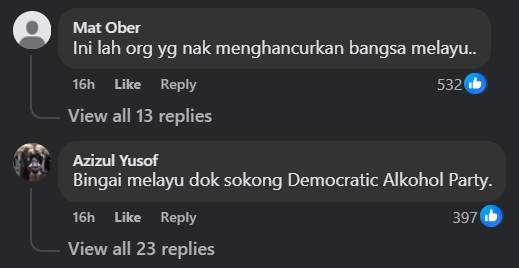 “These are the people who want to destroy the Malay race,” one detractor lashed out at his ungrateful brethren while another cursed the Malay DAP members for “supporting the Democratic Alkohol Party”.