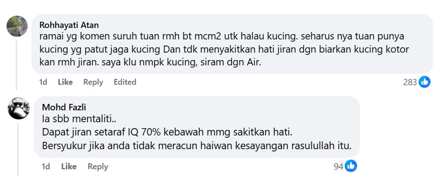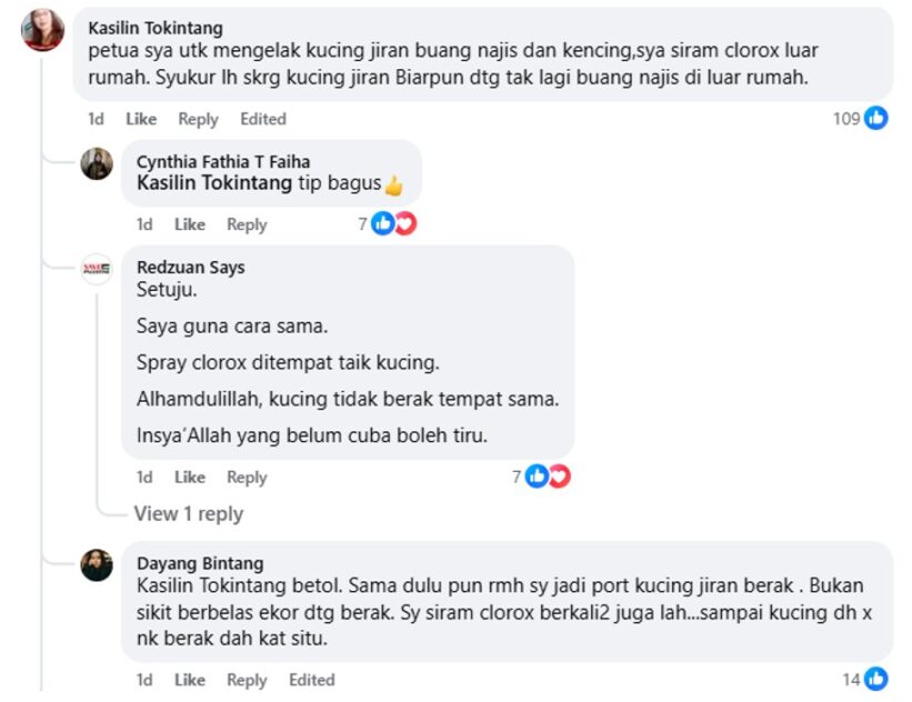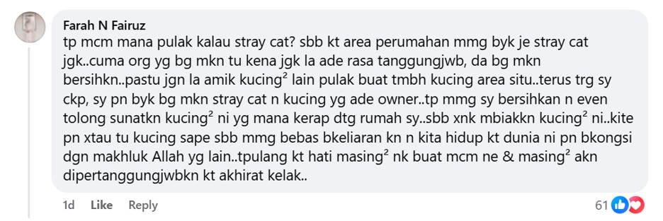 In a lengthy tirade shared on Saja Viral’s Facebook page, she described her anguish in dealing with an inconsiderate neighbour who insisted on feeding stray cats but did not take any further responsibility for their care.