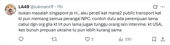 “Typical Singaporean with their bystander culture. Here she would have likely gotten a smackdown,” said @badtrippinbunny. However, @lukmanrff remarked that this was not a Singaporean thing, but a common behaviour displayed by passengers everywhere.