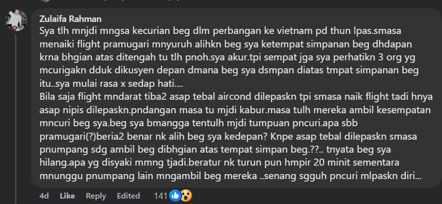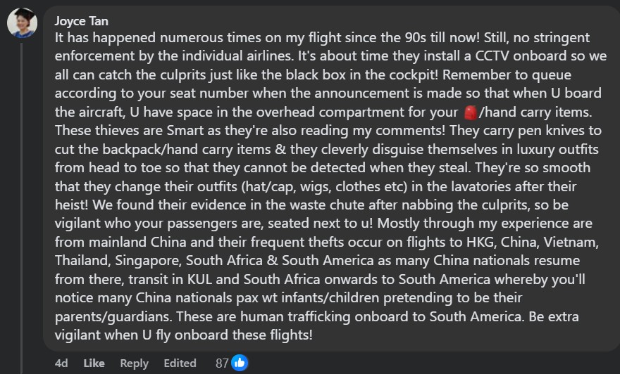 In fact, incidents of in-flight theft are very much on the rise, especially in the Asian region, according to Kuching-based pilot Abangcaptain on Facebook.