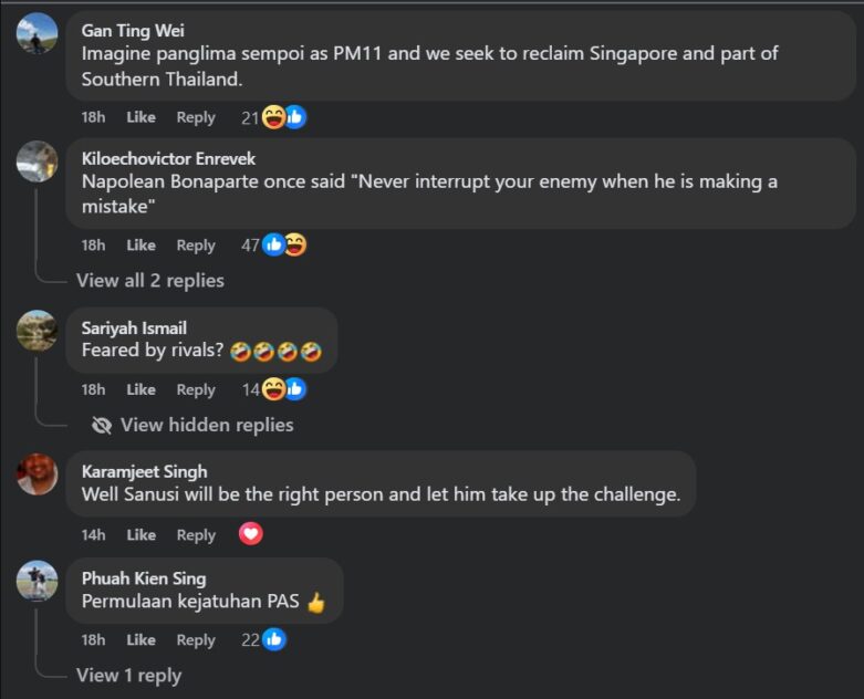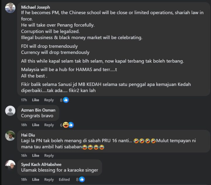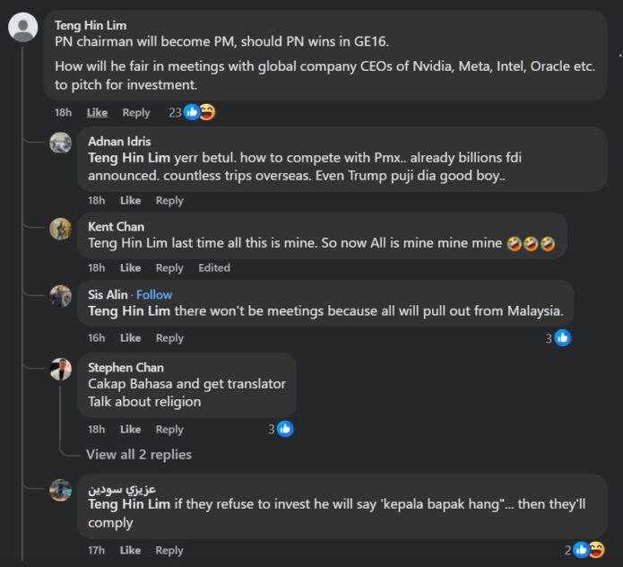 “How will he fair in meetings with global company CEOs of Nvidia, Meta, Intel, Oracle etc. to pitch for investment?” wondered one observer to a Free Malaysia Today (FMT) FB post on the PAS ulama council giving blessing to Sanusi to be PN’s chairman.