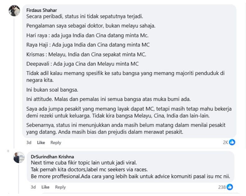 While the good doctor may have made the post with good intentions of halting such unethical conduct of legitimising extended holidays via fake MCs, it may have been better to stop framing the problem along racial lines.