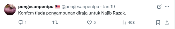 “Confirm there will be no royal pardon for Najib Razak,” added @pengesanpenipu in a video post on X which carried the Agong’s statement.