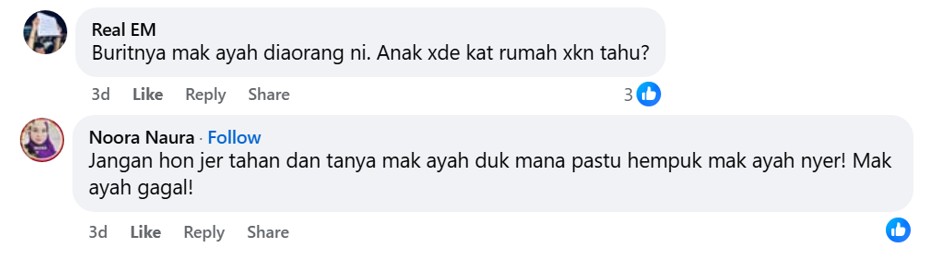 One commenter was of the opinion that mere honking would not deter these daredevils. It was postulated that the cops a.k.a. PDRM (Royal Malaysia Police) need to be called to enforce some much-needed discipline.