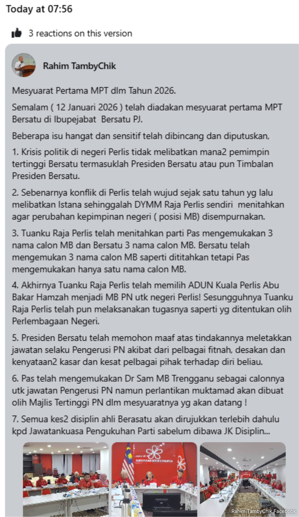 However, Rahim had since amended the social media post to exclude all details about what Bersatu leaders discussed last night, but it was still visible on Facebook’s “edit history”.