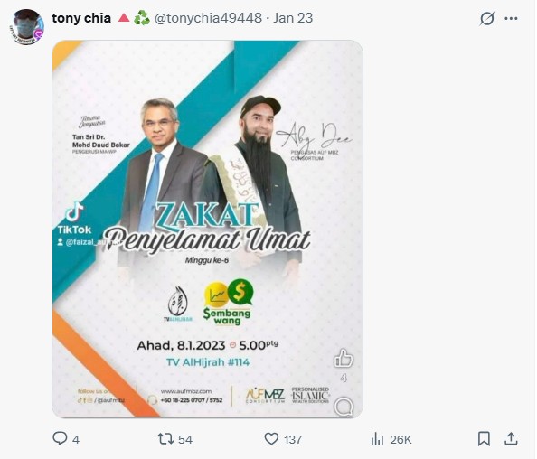 One commenter simply highlighted an apparent publicity poster dated Jan 8, 2023 of Daud – then in his capacity as the Federal Territories Islamic Religious Council (MAIWP) chairman – who was scheduled to appear on TV AlHijrah to address the subject of “Zakat Penyelamat Umat (Tithe as Saviour of Muslims).