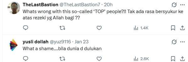 One Muslim commenter lamented “why this so-called TOP people fail to appreciate the rezeki (sustenance) bestowed by Allah” while another described the revelation as a “shame when one prioritises worldly gains”.