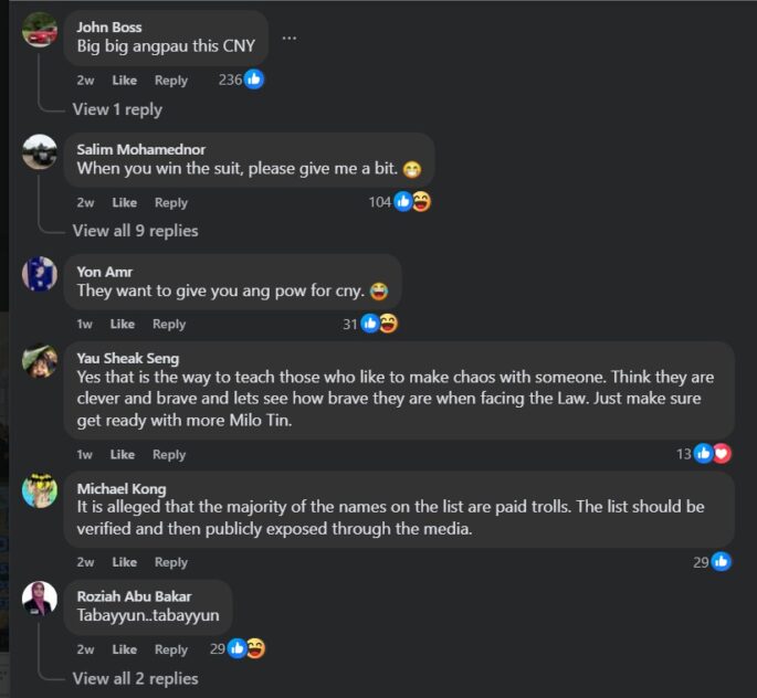 There has been no update if the 19 or so delinquent social media account owners have apologised to Kok but what is certain is that her supporters have teased Kok with the sight of “big, big angpow this CNY”.