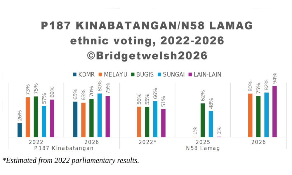 In Lamag, the notable gains were also among Sungai, an estimated 34 percent vote share, but also among Malays and others, estimated 79 percent and 93 percent respectively.