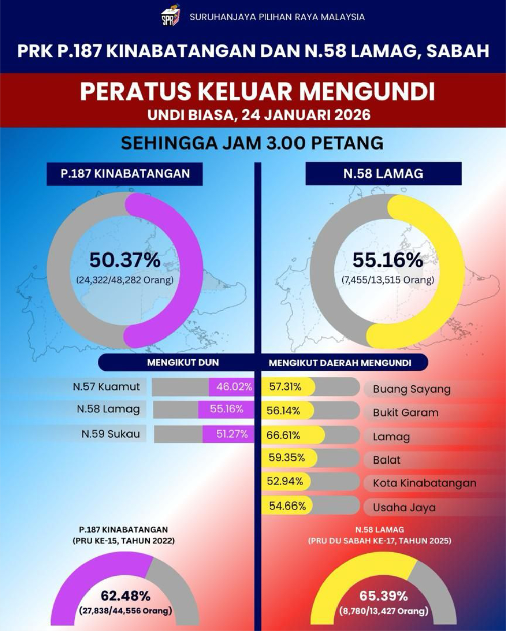 All polling centres for the Kinabatangan and Lamag by-elections have closed at 5.30pm today.