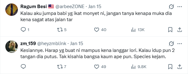 According to netizen @mhazone1988, the monkey was most likely caught to be eaten just like in Thailand. However, some netizens were not so sympathetic such as @Tobiaqguy who said people who have experienced these monkeys disturbing their home will understand.