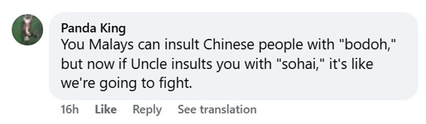 It was claimed by commenter Panda King that the Malays would insult the Chinese with the “bodoh (stupid)” remark but when the latter retaliated in kind with “sohai (id*ot)”, all hell breaks loose.