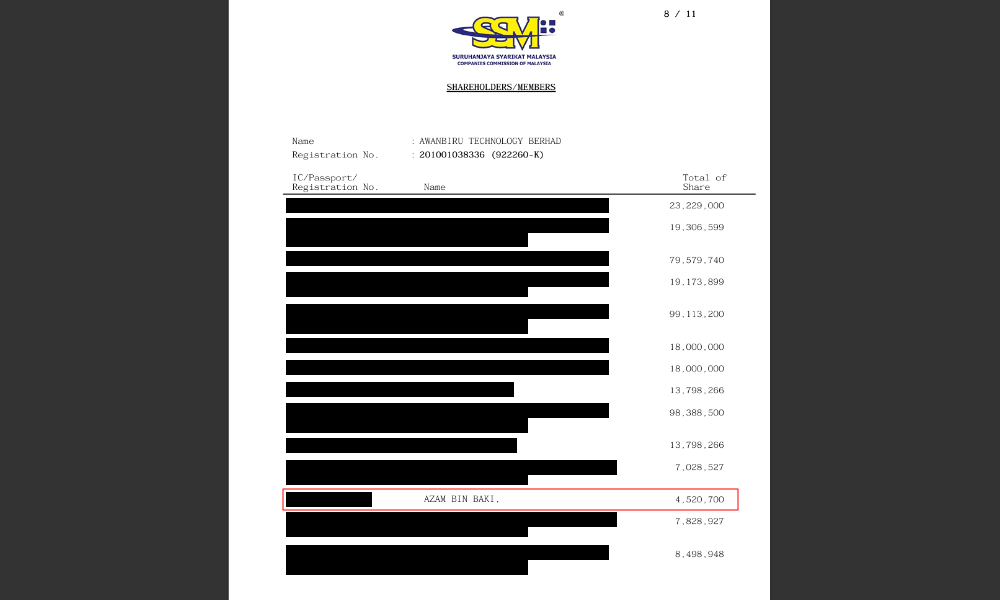 Malaysiakini checked on Azam's shareholdings in Awanbiru Technology by accessing CCM records at 9am on Feb 11. However, eight hours later, Azam’s name is no longer on the document.