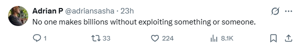 “No one makes billions without exploiting something or someone,” said a cynical @adriansasha while @Waffle_HL subscribes to the concept of the free market.