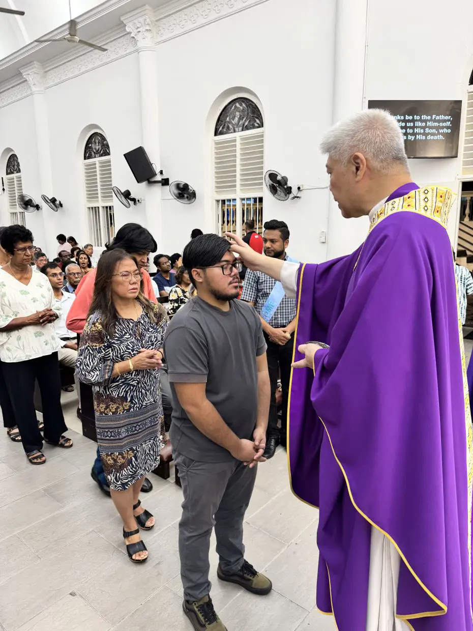 Catholic parishioners congregated at the Church of Our Lady of Lourdes, Klang, where parish priest Reverend Fr. Gregory Chan used the ashes of burnt year-old blessed palm leaves to mark the forehead of the faithful with crosses signifying penance and mortality.