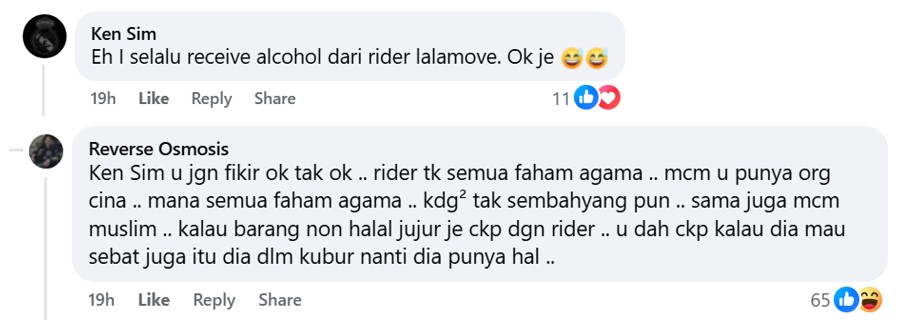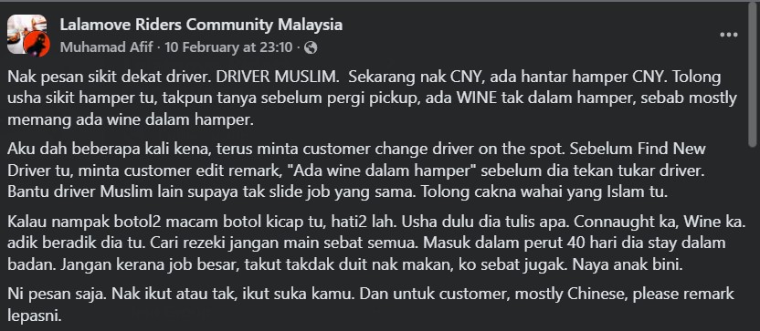 But not quite according to pious Muhamad Afif who cautioned fellow Lalamove drivers against accepting delivery of hampers containing sinful alcoholic beverages.